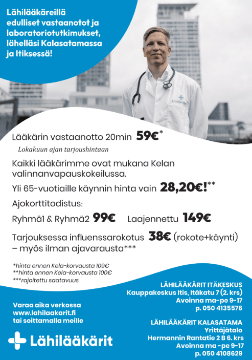 Varaa aika Lähilääkärit Itäkeskukseen verkkosivujemme kautta (www.lahilaakarit.fi) tai puhelimitse numerosta 050 4135576.