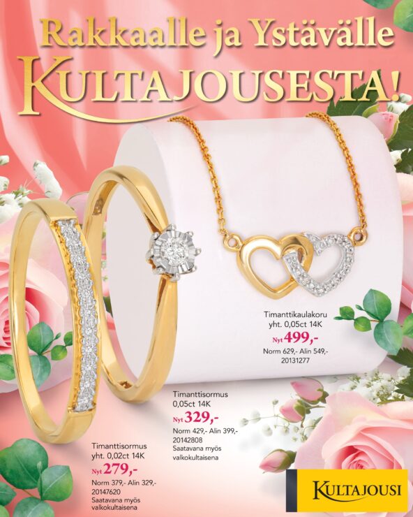 Kultajousi on uudenlainen kultasepänliike, jossa perinteisen kultasepäntaidon arvot yhdistyvät rentouteen ja nuorekkuuteen. Olemme Suomen suurin kello- ja jalometallialan ketjuyritys. Lisäksi kuulumme Pohjoismaiden suurimpaan kello- ja jalometallialan konserniin. Tuomme itse maahan valtaosan tuotteistamme – näin kuluttajat pääsevät nauttimaan edullisista hinnoistamme. Samalla tuotevalikoimamme pysyy ajanmukaisena ja trendikkäänä.