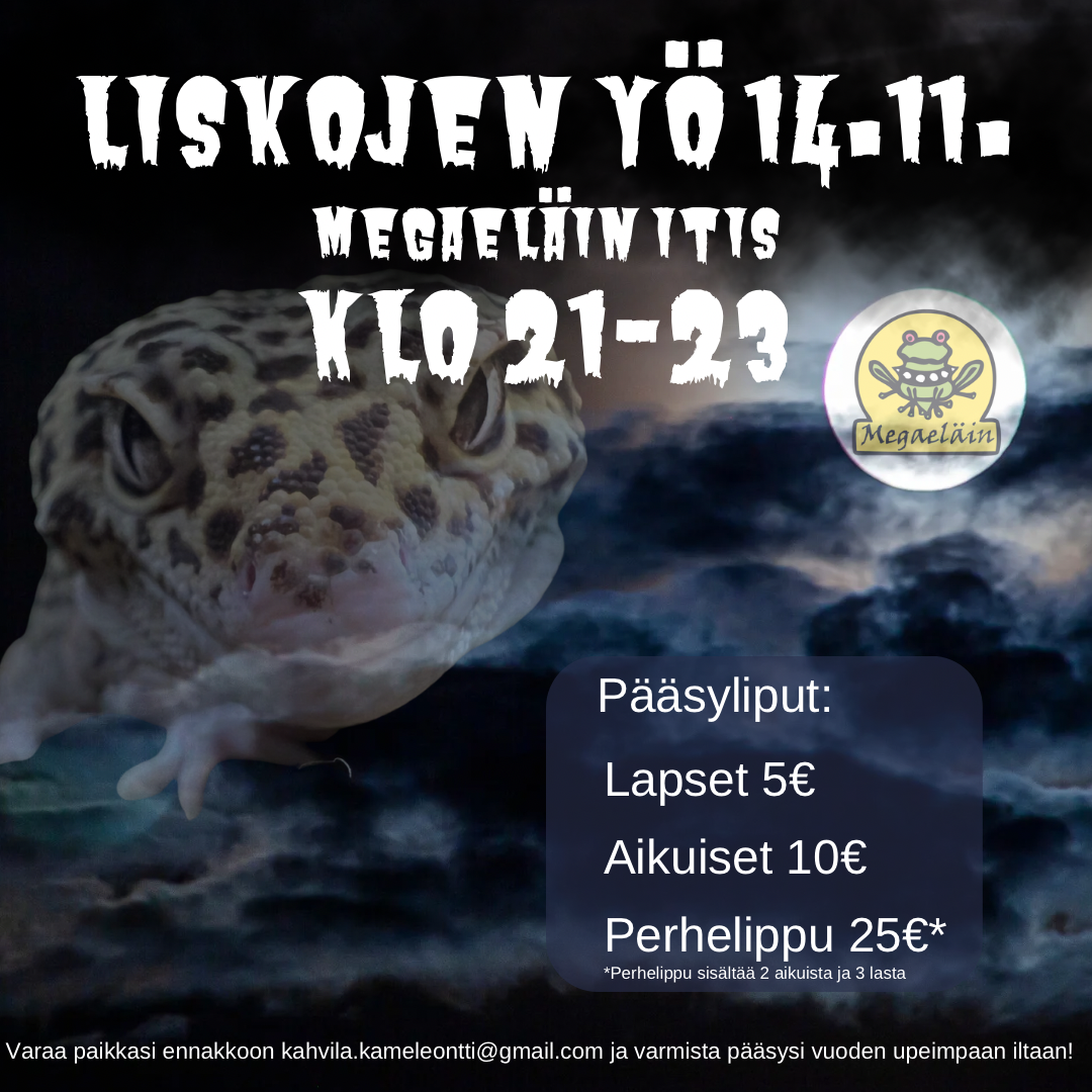 Megaeläin järjestää liskojen yön liiketilan sisällä Kahvila Kameleontissa perjantaina 14.11.2025 klo 21-23. Ilta sopii koko perheelle vauvasta vaariin. Kahvila Kameleontti tarjoilee teeman mukaisia herkkuja sopuisaan hintaan.