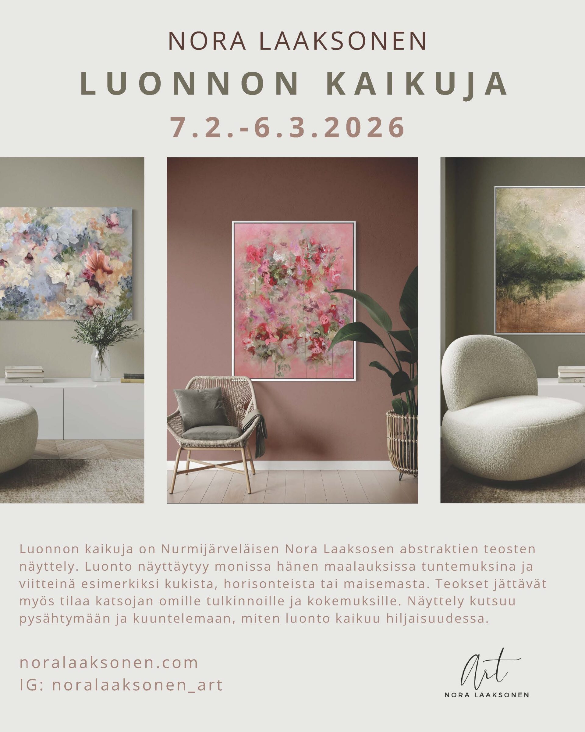 Luonnon kaikuja on Nurmijärveläisen Nora Laaksosen abstraktien teosten näyttely. Luonto näyttäytyy monissa hänen maalauksissa tuntemuksina ja viitteinä esimerkiksi kukista, horisonteista tai maisemasta. Teokset jättävät myös tilaa katsojan omille tulkinnoille ja kokemuksille. Näyttely kutsuu pysähtymään ja kuuntelemaan, miten luonto kaikuu hiljaisuudessa.