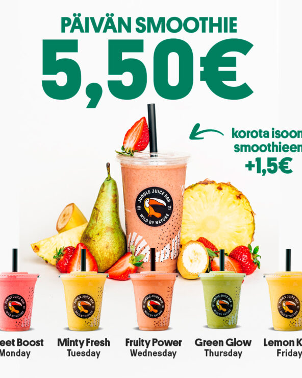 Joka arkipäivä vaihtuva päivän smoothie vain 5,49€ tai isommassa koossa 6,99€!